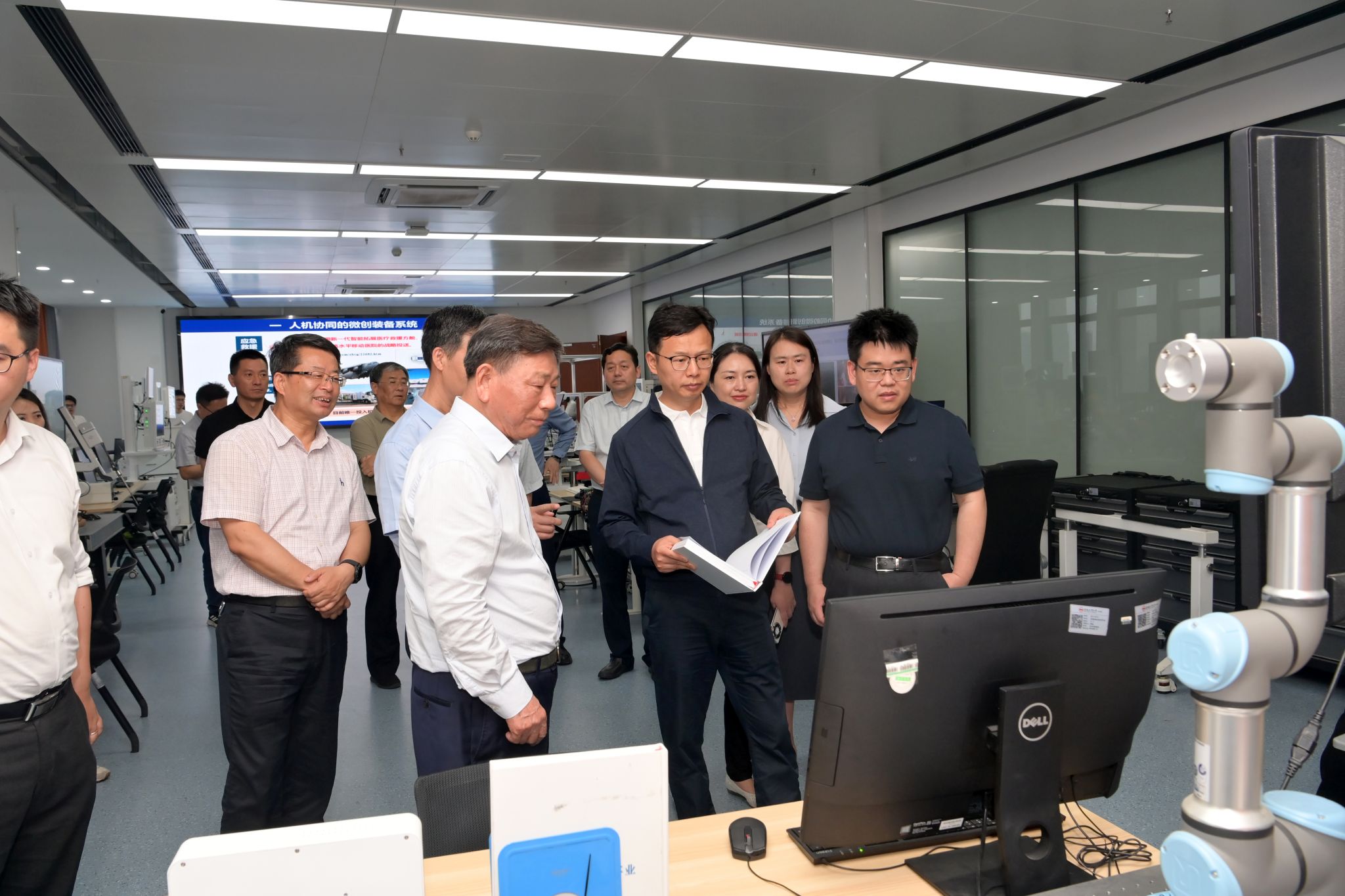 在電能高效高質轉化全國重點實驗室,趙俊強一行認真聽取了科研團隊在新能源發(fā)電與智慧電力、功率半導體與電力變換、智能測控與新能源汽車、雷電防護與特高壓裝備等領域的最新研究成果匯報,詳細詢問相關技術研發(fā)原理及應用領域情況,并勉勵團隊要加強創(chuàng)新能力與產(chǎn)業(yè)需求對接,不斷提升轉化數(shù)量、提高轉化質量、提速轉化效率,以科技創(chuàng)新賦能新質生產(chǎn)力。在工程管理與智能制造研究中心,趙俊強一行聽取了楊善林院士關于學校培養(yǎng)拔尖創(chuàng)新人才、推進“雙一流”建設等情況介紹。結合展板、實驗模型和實驗裝置,趙俊強參觀調研了空天系統(tǒng)智能管控實驗室、醫(yī)療機器人與智慧醫(yī)療健康管理實驗室以及智能制造工程管理實驗室,對科研團隊取得的豐碩成果給予高度評價,并鼓勵他們繼續(xù)瞄準國際科技前沿和國家重大需求發(fā)力,加強原創(chuàng)性、顛覆性科技創(chuàng)新,更好服務國家高水平科技自立自強。