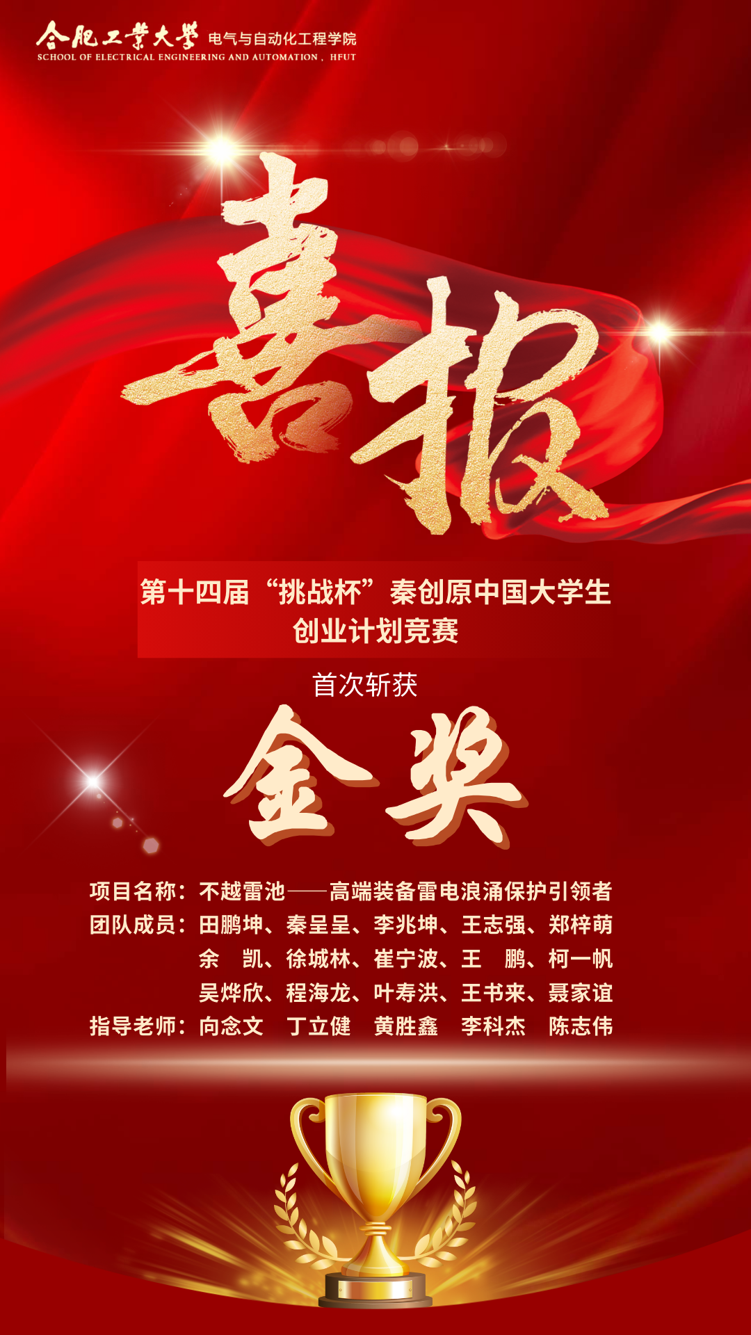 10月29日至11月2日,由共青團中央、教育部、人力資源社會保障部、中國科協(xié)、全國學(xué)聯(lián)、陜西省人民政府聯(lián)合主辦的第十四屆“挑戰(zhàn)杯”秦創(chuàng)原中國大學(xué)生創(chuàng)業(yè)計劃競賽于西安交通大學(xué)舉行。經(jīng)過激烈角逐,我院《不越雷池--高端裝備雷電浪涌保護引領(lǐng)者》項目(指導(dǎo)老師:向念文、丁立健、黃勝鑫、李科杰、陳志偉;團隊成員:田鵬坤、秦呈呈、李兆坤、王志強、鄭梓萌、余凱、徐城林、崔寧波、王鵬、柯一帆、吳燁欣、程海龍、葉壽洪、王書來、聶家誼)斬獲全國金獎,這是我院在全國“挑戰(zhàn)杯”賽事上的歷史性突破。