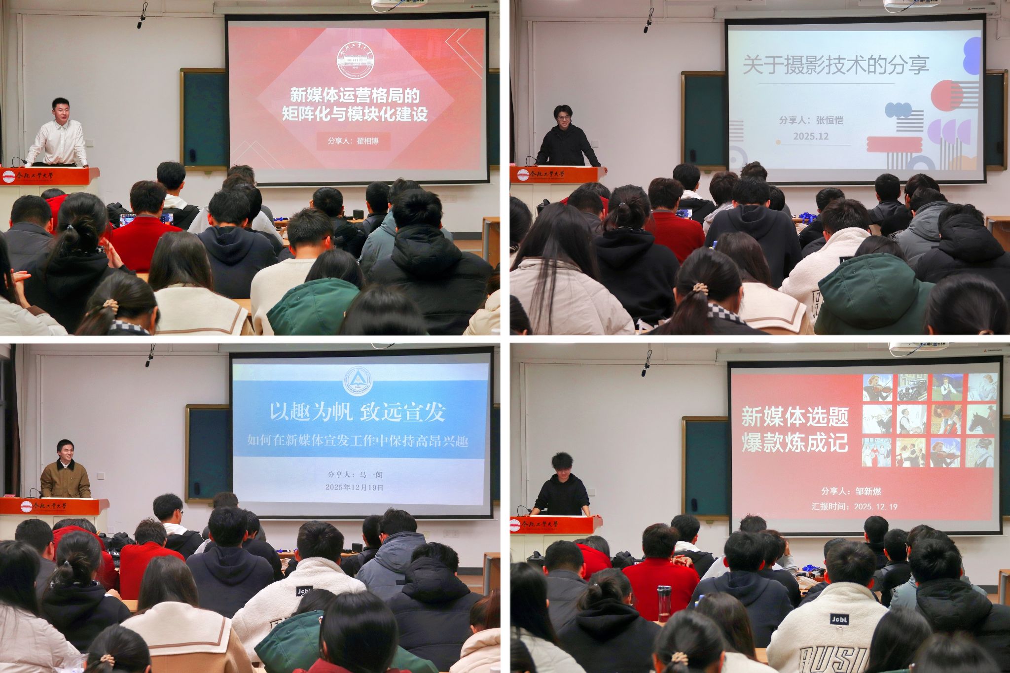 校全媒體中心翟相博同學(xué)圍繞圖、文、聲、視四種傳播路徑,分享了優(yōu)秀宣傳載體的打磨技巧,并對新媒體運營格局的矩陣化與模塊化建設(shè)提出思考見解。校團委新媒體中心張恒愷同學(xué)從相機使用要領(lǐng)、曝光基礎(chǔ)元素、構(gòu)圖實例分析等方面,結(jié)合自身豐富的影像創(chuàng)作經(jīng)驗,詳細分享了攝影攝像技巧。明理苑網(wǎng)絡(luò)文化工作室馬一朗同學(xué)以“致遠宣發(fā),以趣為帆”為主題,闡述了在新媒體工作中保持興趣、心懷熱情、團結(jié)協(xié)作的重要意義。學(xué)院新媒體中心往屆主任鄒新燃同學(xué)回顧了任職期間的工作經(jīng)歷,并以“選題爆款練成記”為題,講述了選題思路拆解、文風(fēng)審美進階、熱點線索捕捉等內(nèi)容。