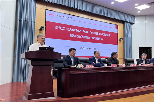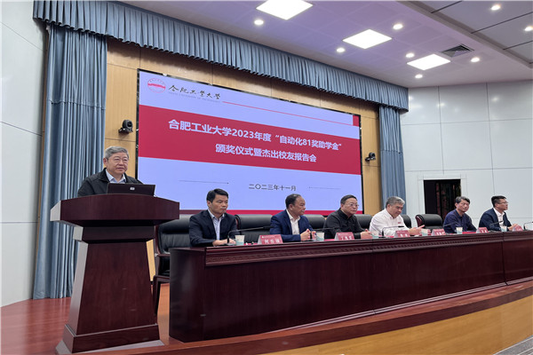 11月2日,合肥工業(yè)大學(xué)第九屆“自動化81獎助學(xué)金”頒獎儀式暨杰出校友報告會在學(xué)術(shù)會議中心一樓大報告廳舉行。校黨委常委、副校長劉曉平,“自動化81獎助學(xué)金”捐贈校友代表、深圳達實智能股份有限公司董事長劉磅,上海達實公司總經(jīng)理王丹宇,廣州科技金融創(chuàng)新投資控股有限公司資深投資經(jīng)理楊林,合肥華星集團董事長吳延陵,安徽省電力經(jīng)濟技術(shù)研究院院長李淮海等出席儀式。